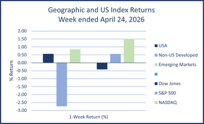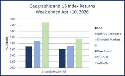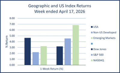 For the week ended April 17th, 2026, stocks were higher everywhere for the third straight week. Bonds were also higher for the week as the iShares Core US Aggregate Bond ETF (AGG) rose 0.53% with yields falling; the 10-year US treasury yield dropped to 4.25%, according to Yahoo Finance. Asset price drivers of the week: